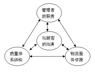3.物流服务质量体系 物流服务质量体系主要有管理者的职责、资源、质量体系结构三个关键方面,其关系见下图。