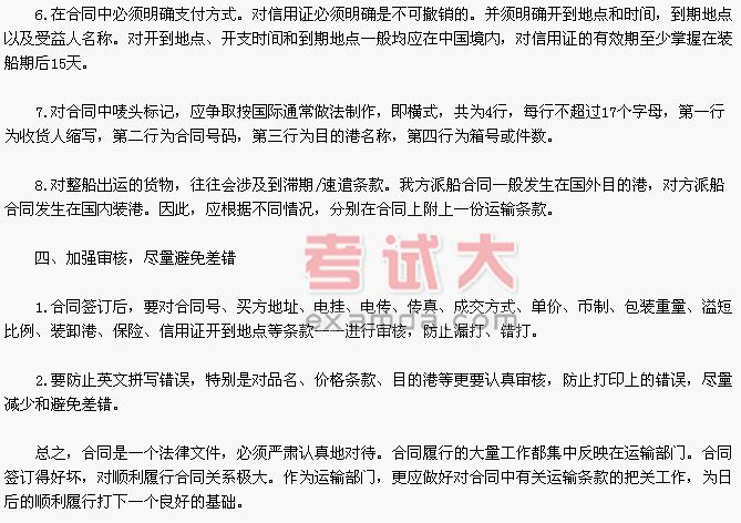 1.对交货目的港不要只写国名地区名称,如美国港口等,因一个国家有很多港口只写国名不利于船舶的安排。对有重名港口名称后要写上国名。如维多利亚,加拿大、几内亚等国家都有叫维多利亚的港口。如对方派船合同,装港必须明确,卸港则可按买方要求办理。