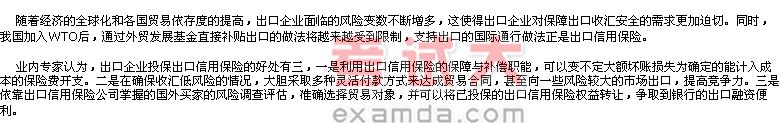 为什么我国的出口信用保险有行无市呢?出口信用保险公司承保部负责人王文全先生介绍说,原来由中国人民保险公司和进出口银行两家机构同时经营的出口信用保险,但在整体业务中占有的比重较小,同时两者机构重叠,职能交叉,导致效率低下,同时投保费率过高,法律保障体制又不健全,这些都制约了出口信用保险的发展。另一方面就是出口企业的保险意识普遍不强,不少企业并不了解出口信用保险这项业务。