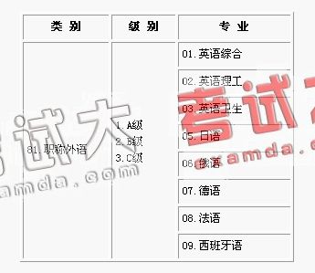 1、英语分为综合、理工、卫生3个类别,每个类别分为A、B、C 三个级别,日语、俄语、德语、法语、西班牙语不分类别,只划分为A、B、C 三个级别。报考人员可任意选择一个语种。