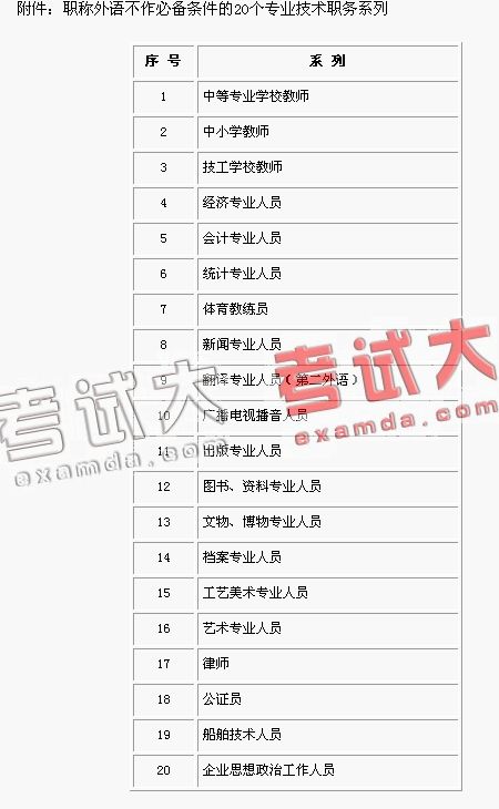 1、申报经济、会计、新闻等20个系列(专业)专业技术资格,职称外语不作必备条件(具体见附表)。