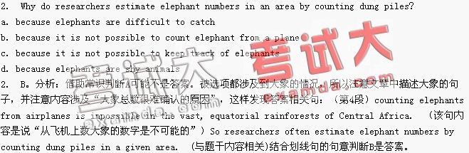 3 C。分析:问题说“不能凭借粪的堆数(来确认大象数目)”,注意文章中相关的句子,这样在上一题的答案相关句后不断发现“decay”这个词,推测C是答案。相关句内容:They also need to know the rate at which dung decays. Because it’s extremely difficult to determine these rates, however, researchers tallying(计算) elephants in one region tend to rely on standard decay rates established elsewhere.这些句子在内容上提到“科学家需要知道粪便的腐烂速度,需要依靠在其他任何地方都被认可的标准腐烂速度”,因此判断C是答案。