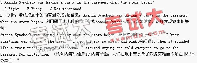 C.分析:考虑把题干内容划分成2层:There had not been such a severe storm in Trumbull County + for a hundred years,利用题干中出现的特征短语a hundred years作为答案线索,这样发现文章中根本没有这样时间状语结构出现,因此判断该句为“没提到”。