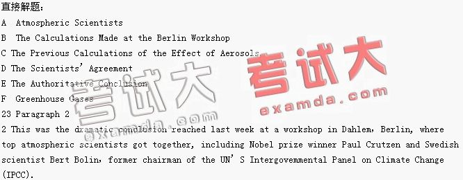 C:分析:根据段落中出现的核心词aerosols首先判断C很可能是答案,而且段落倒数第2句的大意“Until now,they reckoned that…/在此以前,他们一直估计…”,该结构含义与C呼应。