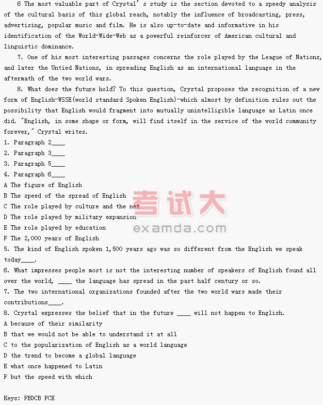 2. It is certainly quite a theme. When Julius Caesar landed in Britain more than 2,000 years ago, English did not exist. Five hundred years later, English, virtually incomprehensible to modern ears, was probably spoken by about as few people as currently speak Cherokee, the language of a small North American Indian tribe-and with little influence. About 1,000 years later, at the end of the 16th century, and after the Norman Conquest, the Reformation and the arrival of commercial printing technology, English was the native speech of between 5 million and 7 million people. And yet now look at it. As the second millennium approaches, English is more widely scattered, more widely spoken and written than any other language has never been. In the title of the book, it has become a truly global language. According to David Crystal, about 2.09 billion people, well over one-third of the world’s population are routinely exposed to it.