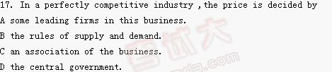 Perfect competition exists in an industry that contains many relatively samll firms producing identical products.The most importhant characteristic(特征) of a perfectly competitive industry if that no single firm has any control over prices.This important characteristic follows from two assumptions(假设).First, a competitive industry is composed of many firms, each being very samll relative to the size of the industry .S***nd ,every firm in a perfectly competitive industry producse exactly the same product.