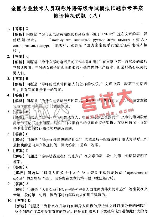 考试大整理:07年职称俄语全真模拟试题(八)答案