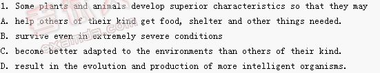 Each living thing is adapted to its way of life in a general way, but each is adapted especially to its own distinct class. A plant, for example, depends upon its roots to fix itself firmly and to absorb water and inorganic chemicals. It depends upon its green leaves for using the sun's energy to make food from inorganic chemicals. These are general adaptations, common to most plants. In addition, there are special adaptations that only certain kinds of plants have.来源:考试大