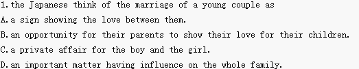Some Japanese still get married by parents arrangement. Yoshio and Hiromi Tanaka, a young Japanese couple living in the United States, told the story of their arranged marriage. We didnt marry for love in the Western sense. We got married in the traditional Japanese way. Our parents arranged our marriage through a matchmaker(媒人). In Japan we believe that marriage is something affecting the whole family rather than a matter concerning only the young couple. So we think it is very important to match people according to their social background, education and so on. When our parents thought it was time for us to get married, they went to a local matchmaker and asked her for some suggestions. We discussed the details and looked at the photos she sent, and then our parents asked her to arrange a marriage interview for the two of us.