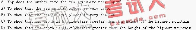 The sea is also very deep in some places. It is not deep everywhere. Some parts of the sea are very shallow. But in some places the depth of the sea is very great. There is one spot, near Japan, where the sea is nearly 11 kilometers deep! The highest mountain in the world is about 9 kilometers high. If that mountain were put into the sea at that place, there would be 2 kilometers of water above it! What a deep place!
