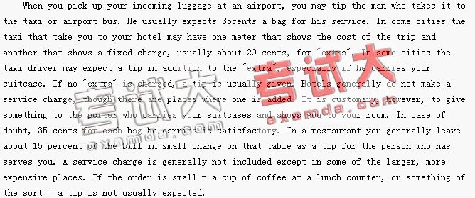 In any countries there is a fixed charge for personal services. A certain percentage may be added to the hill at a hotel or restaurant "for the service". In other places the customer may be expected to give a tip, or a small amount of money, as a sign of appreciation whenever services are performed. In the United States there is no consistent practice in regard to tipping. The custom is more common in a large city than in a small town. A native American may often be in doubt about when and how much to tip when he is in a city that is strange to him. In general, however, a tip is expected by the porter who carries your baggage, by taxi drivers (except, perhaps, in small town), and by those who serve you in hotels and restaurants.