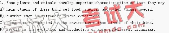 Certain animals and plants develop characteristics that help them cope with their environment better than others of their kind. This natural biological process is called adaptation. Among the superior characteristics developed through adaptation are those that may help in getting food or shelter, in providing protection, and in producing and protecting the young. That results in the evolution of more and more organisms that are better fitted to their environments. 来源:www.examda.com