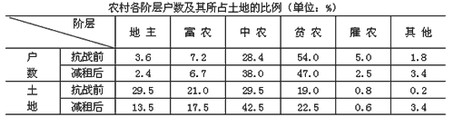 (3)上表说明,封建势力虽然有所削弱,但封建的剥削关系仍然存在,少数地主仍然占有较多的土地,广大农民,特别是贫雇农,占有的土地仍然较少,他们的经济地位并没有得到根本改变。因此,减租减息政策是一项适用于抗日占争这个特定历史时期的过渡性政策。要消灭封建剥削制度,完成新民主主义革命,必须进行彻底的土地改革。(3分)
