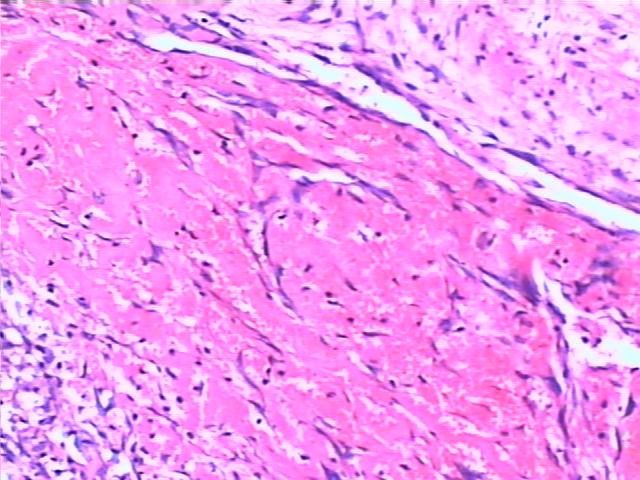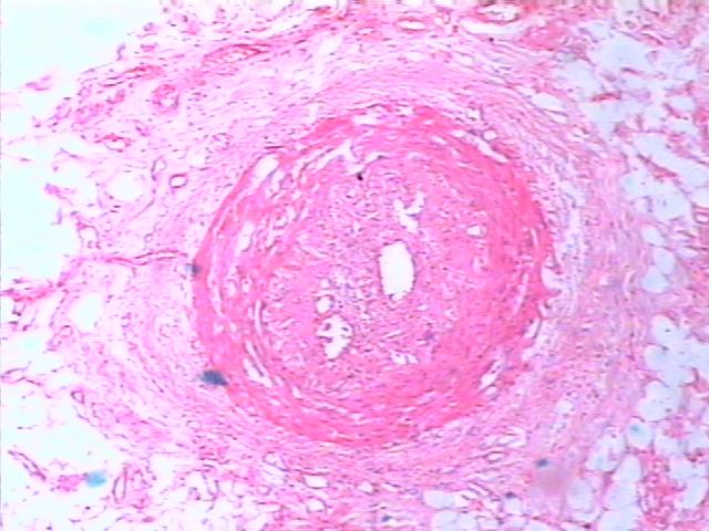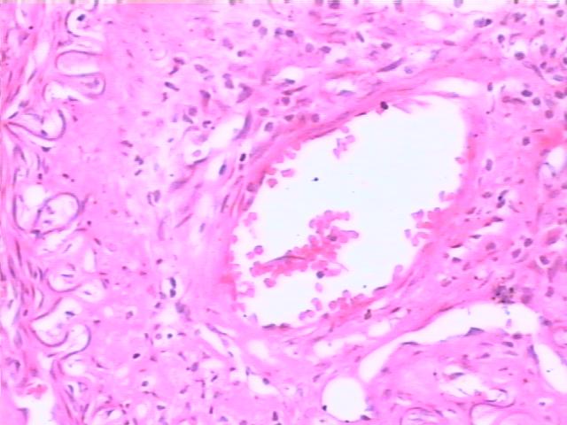 2.血栓与血管壁相连处可见较多毛细血管、成纤维细胞、纤维细胞(机化)