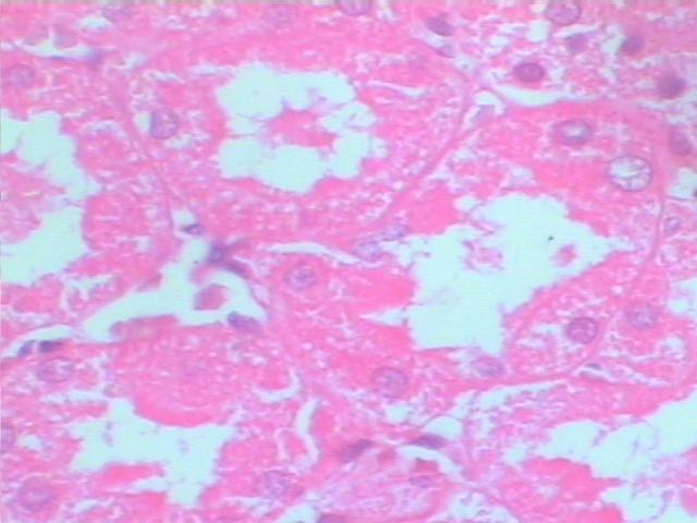 ①近曲小管上皮细胞肿胀,且向腔内突出,细胞界限不清,胞浆内布满红染的微细颗粒(即:肿胀的线粒体和扩张的内质网),部分上皮细胞因极度肿胀破裂,致使腔内有红染的颗粒状蛋白性物质堆积