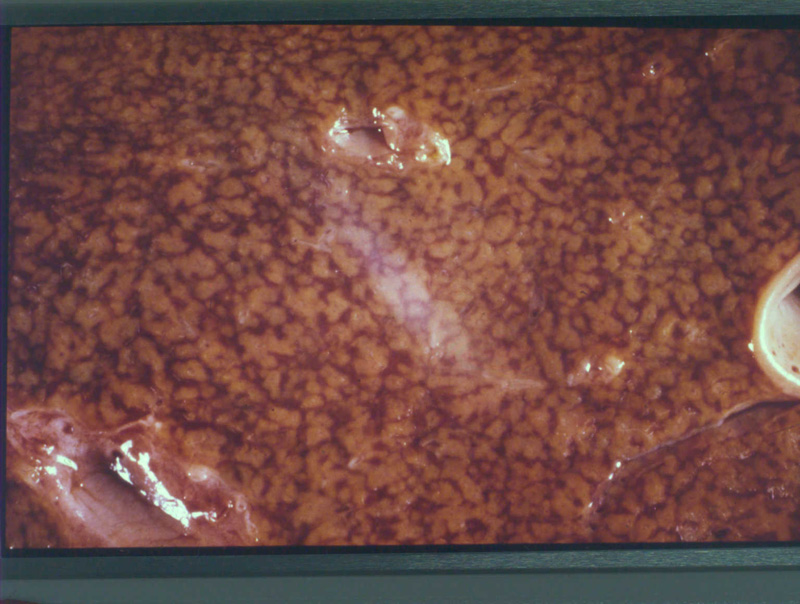 1.脏器表面和切面见一灰白色三角形坏死灶;
