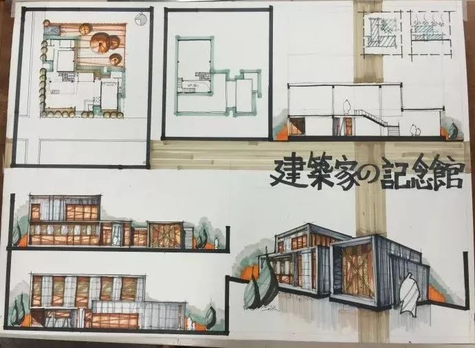 但是作为中国考生的话,我个人还是推荐使用马克笔,一来中国的马克笔比较便宜,二来 马克笔上色比较快,明暗对比明显,利于表现建筑的性体感。对于报考东京大学的学生, 我强烈建议一定要上色,那样的话作品的完成度看起来很高,这是十分重要的!其他的学 校基本也都是这样的,具体的要求可以参照各自学校的主页和过去问。