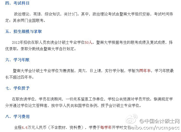 暨南大学2012年招收在职人员攻读会计硕士专业学位(MPAcc)招生简章