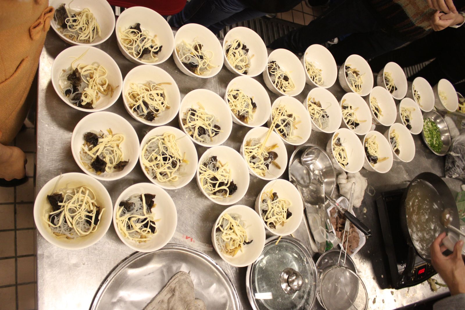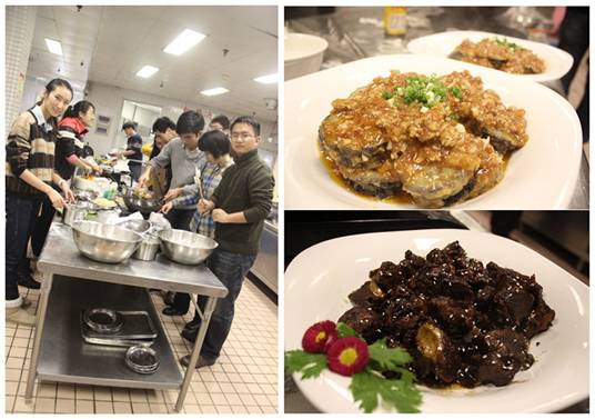 第一部分是厨艺展示。通过前期自愿报名的方式产生12个小组,他们各自带来拿手菜或者家乡特色,包括河南烩面、四川麻辣香锅、荷塘月色和肉末茄盒等,各种美味让在场的同学