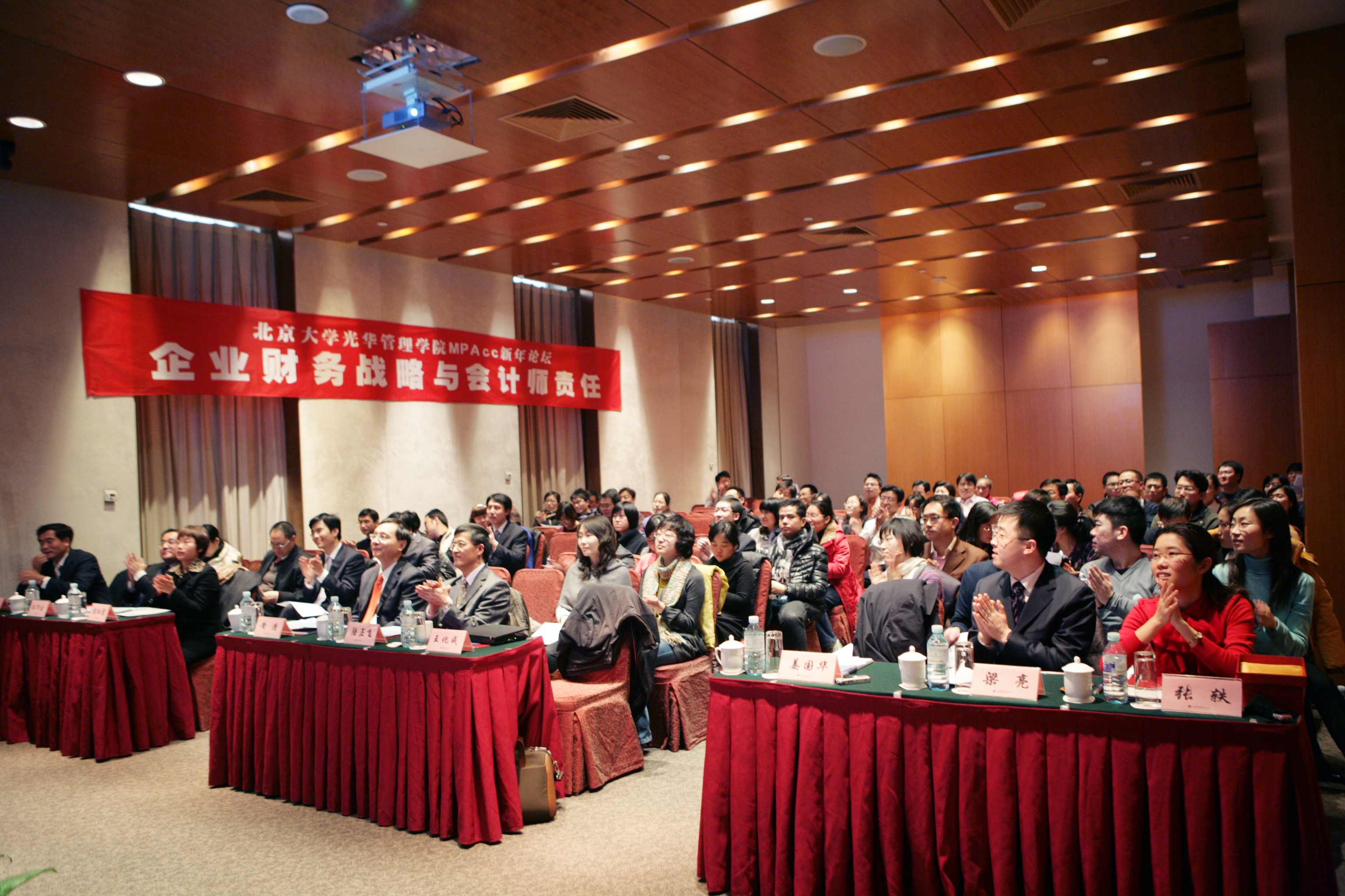 2010年1月10日下午北京大学光华管理学院第三届MPAcc新年论坛在北大博雅国际会议中心隆重举行。论坛秉承了光华管理学院“创造管理知识,培养商界领袖,推动社会进步”的宗旨,着眼现在、放眼未来,旨在创建光华MPAcc与社会各界的交流平台。此次论坛的主题是企业财务战略与会计师责任。出席论坛活动的有:北京大学光华管理学院党委书记、副院长、MPAcc中心主任陆正飞教授;中国人民大学教授、博士生导师,著名财务管理学家,全国会计专业硕士学位教育指导委员会委员兼秘书长王化成教授;中国神华能源股份有限公司董事会秘书、北京上市公司协会副理事长、美国艾森豪威尔基金会高级访问学者黄清先生;北京大学光华管理学院会计系副系主任、MPAcc项目执行主任姜国华老师以及MPAcc各界校友、在读学生等。