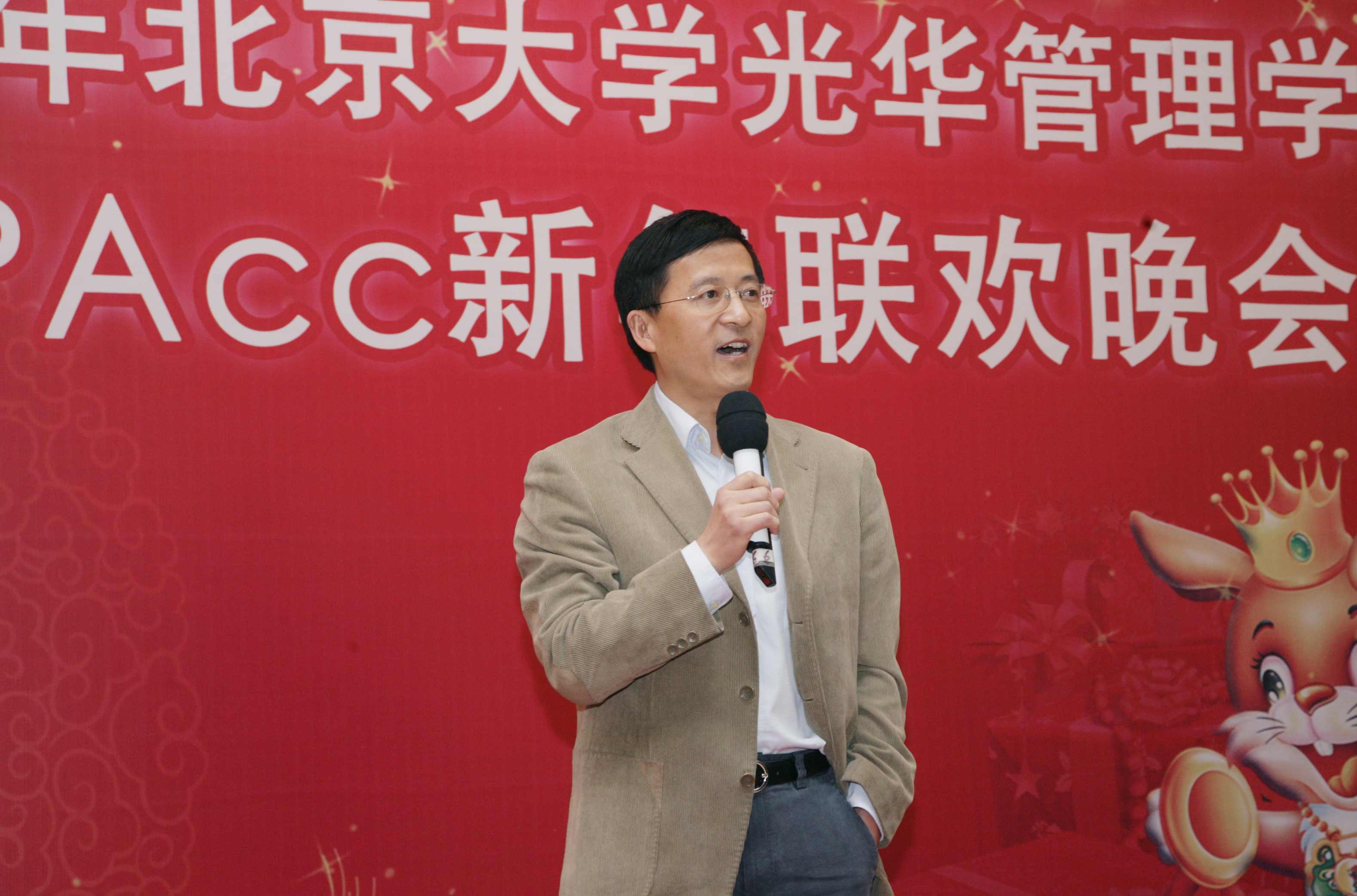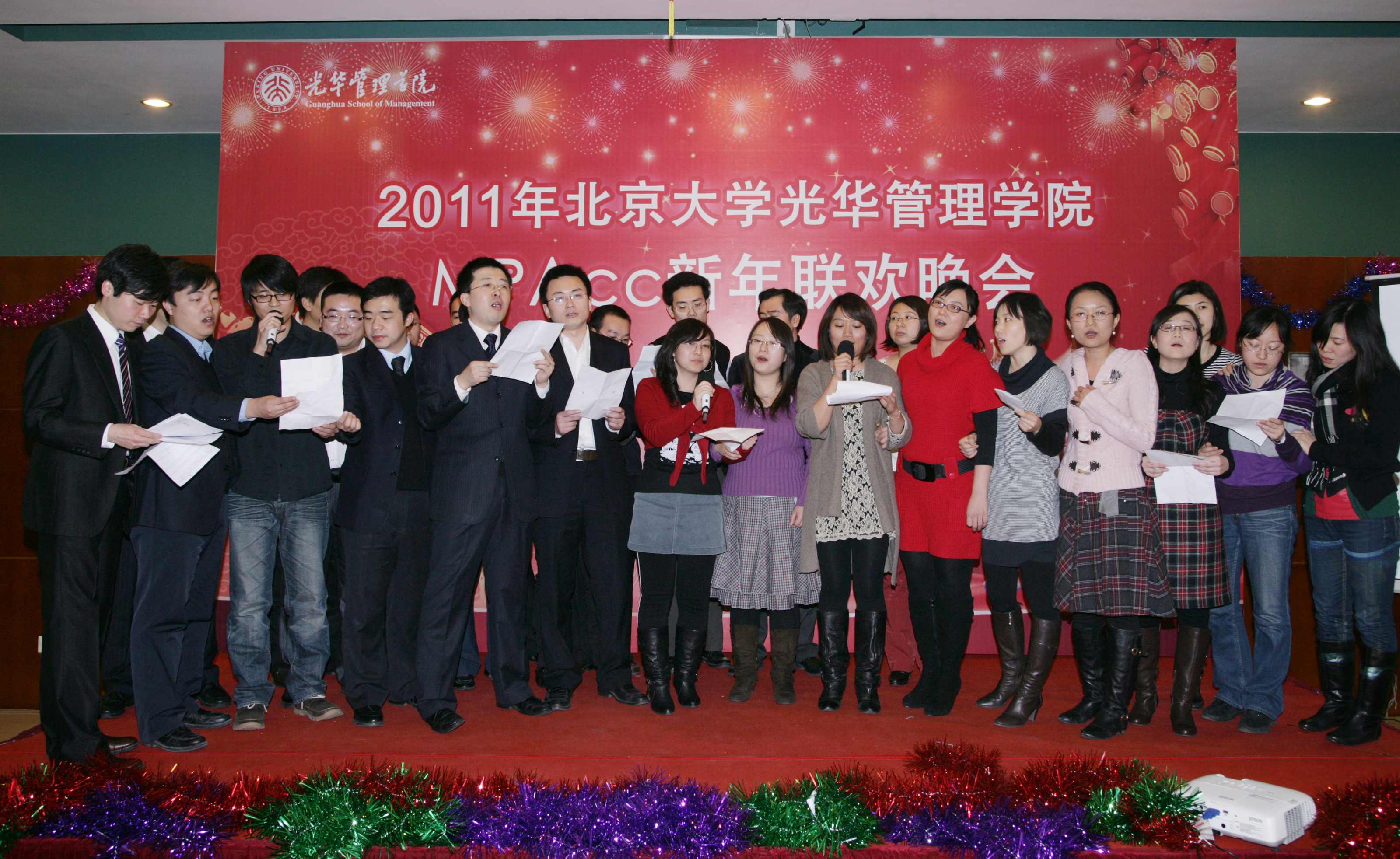 2011年1月8日,北大农园三层餐厅,新老MPAcc学生济济一堂,现场充满笑语欢歌。晚6点,北京大学光华管理学院MPAcc新年联欢会准时开始了!出席本次晚会的有:光华管理学院院长蔡洪滨教授,光华管理学院党委书记、副院长、MPAcc项目主任陆正飞教授,光华管理学院管理科学与信息系统系王其文教授,光华管理学院会计系李怡宗教授,光华管理学院会计系黄慧馨教授,光华管理学院组织管理系王新超教授,2010级MPAcc特聘导师、北京世博科脉科技有限公司总经理常骅先生,北京大学研究生院副院长、光华管理学院会计系副主任、MPAcc项目执行主任姜国华教授,光华管理学院MPAcc中心张轶、姚学远老师以及来自清华大学等兄弟院校的MPAcc学生代表。