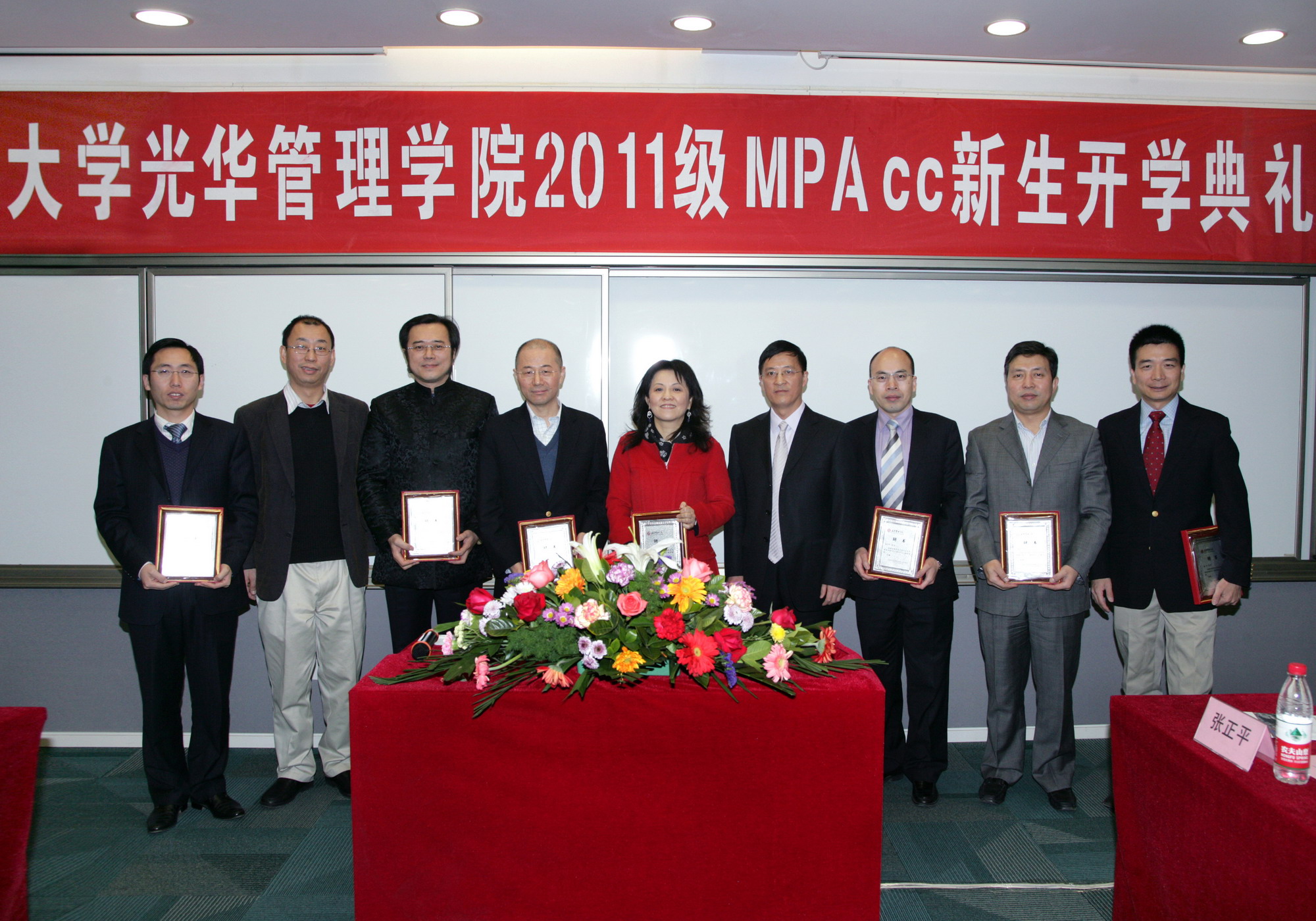 阳春三月,未名争辉。2011年3月6日,北京大学光华管理学院2011级MPAcc新生开学典礼在光华管理学院新楼109教室隆重举行。出席开学典礼的有:北京大学光华管理学院党委书记、副院长、MPAcc中心主任陆正飞教授,北京大学研究生院副院长、光华管理学院会计系副主任、MPAcc中心执行主任姜国华教授,北京大学光华管理学院2011级MPAcc班主任张然教授,中国信达资产管理股份有限公司法律部总经理罗振宏先生,中国国家航空公司高级副总裁樊澄先生以及中通和达投资有限公司董事长王开元先生,赛尔网络有限公司总会计师王萍女士,加多宝集团审计总监李昂先生,东方证券股份有限公司投资银行部执行总经理张正平先生,神农投资总经理陈宇先生等特聘导师和嘉宾。整场开学典礼由姜国华老师主持。