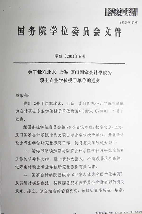 在财政部领导的大力支持和推动下,北京国家会计学院历经两年多的硕士专业学位授予权申请工作终于画上圆满句号。近日,国务院学位委员会第28次会议审议通过了批准北京国家会计学院为硕士专业学位授予单位的决定。同时,被授予硕士专业学位授予单位的还有上海、厦门国家会计学院。北京国家会计学院取得硕士专业学位授予权是学院发展进程中具有里程碑意义的一件大事,为学院建设商学院特色的知名会计学院、实现跨越式发展奠定了坚实的基础。