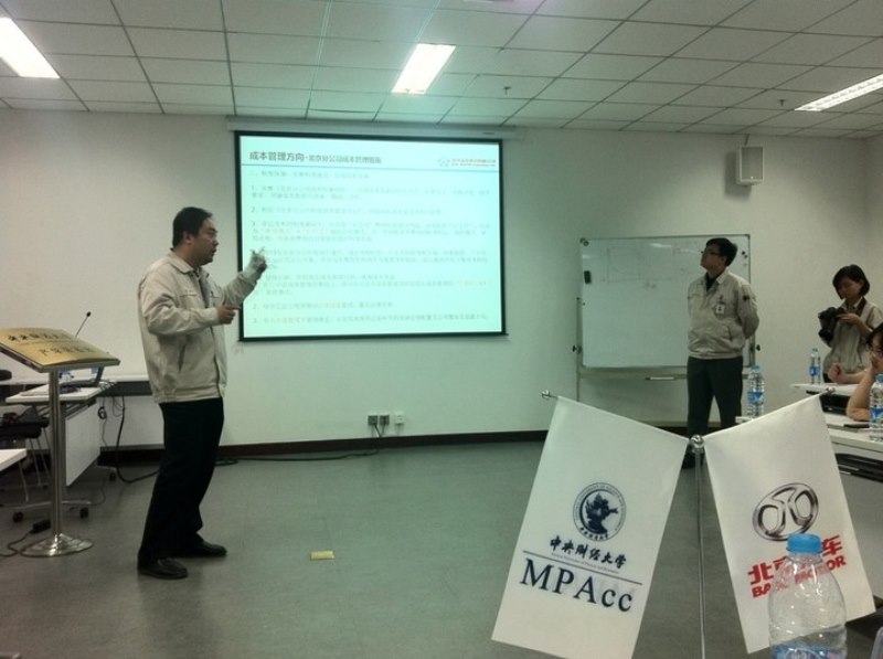 5月13日,我校2012级全日制MPAcc学员赴北汽股份北京分公司考察学习,随行的指导老师和带队老师有会计学院副院长刘俊勇教授、陈刚副教授和王春飞老师。北汽股份北京分公司副总经理李德仁和财务管理科科长鲍宇明亲临现场指导。