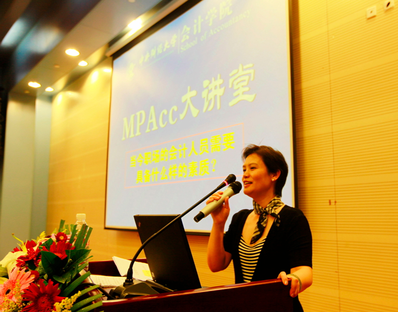 2013年9月15日晚,会计学院研究生客座导师、中国主权财富基金-中国投资有限责任公司(“中投公司”)财务部副总监陈静女士做客“中央财经大学MPAcc大讲堂”,在学术会堂402报告厅做了题为《当今职场的会计人员需要具备什么样的素质》的专题讲座。