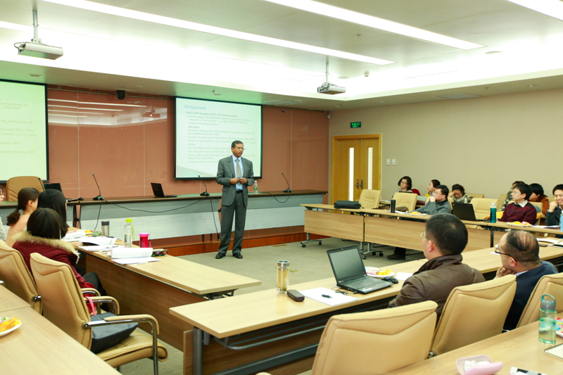 Measurement Inconsistencies, and Composition, and the Relevance of Non-GAAP Earnings of Red Chip Companies”。该文研究了2010年至2011年在香港上市的红筹公司在会计准则要求以外披露的盈余(Non-GAAP Earnings)的度量一致性及其价值相关性。第二次讲座安排在3月12日下午,报告的论文题目为“Investor protection, firm fundamentals information, and stock price synchronicity”。论文利用跨国样本,研究了公司基本面信息与股价同步性的关系,以及投资者保护水平对公司基本面信息和股价同步性关系的影响。