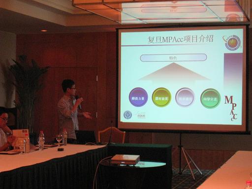 随后,2010级MPAcc的在读学生结合自身的备考经验和来到复旦就学近半年来的学习感受同与会的考生进行分享、交流。黄震宇同学侧重分享了他在复旦MPAcc就读期间对复旦深厚的文化底蕴的心得以及对任课教授扎实的学术功底和楷模般的师德的感动;而殷文晋同学则结合自己备考的过程、参加案例大赛的经历以及自己异地读书的体验与到会的考生进行了生动的交流。在读学生的切身感受、备考经历、学习体会等经验分享,使前来咨询的考生获得了许多对复旦MPAcc实质性的了解,增强了他们报考的信心。取得了良好的效果。