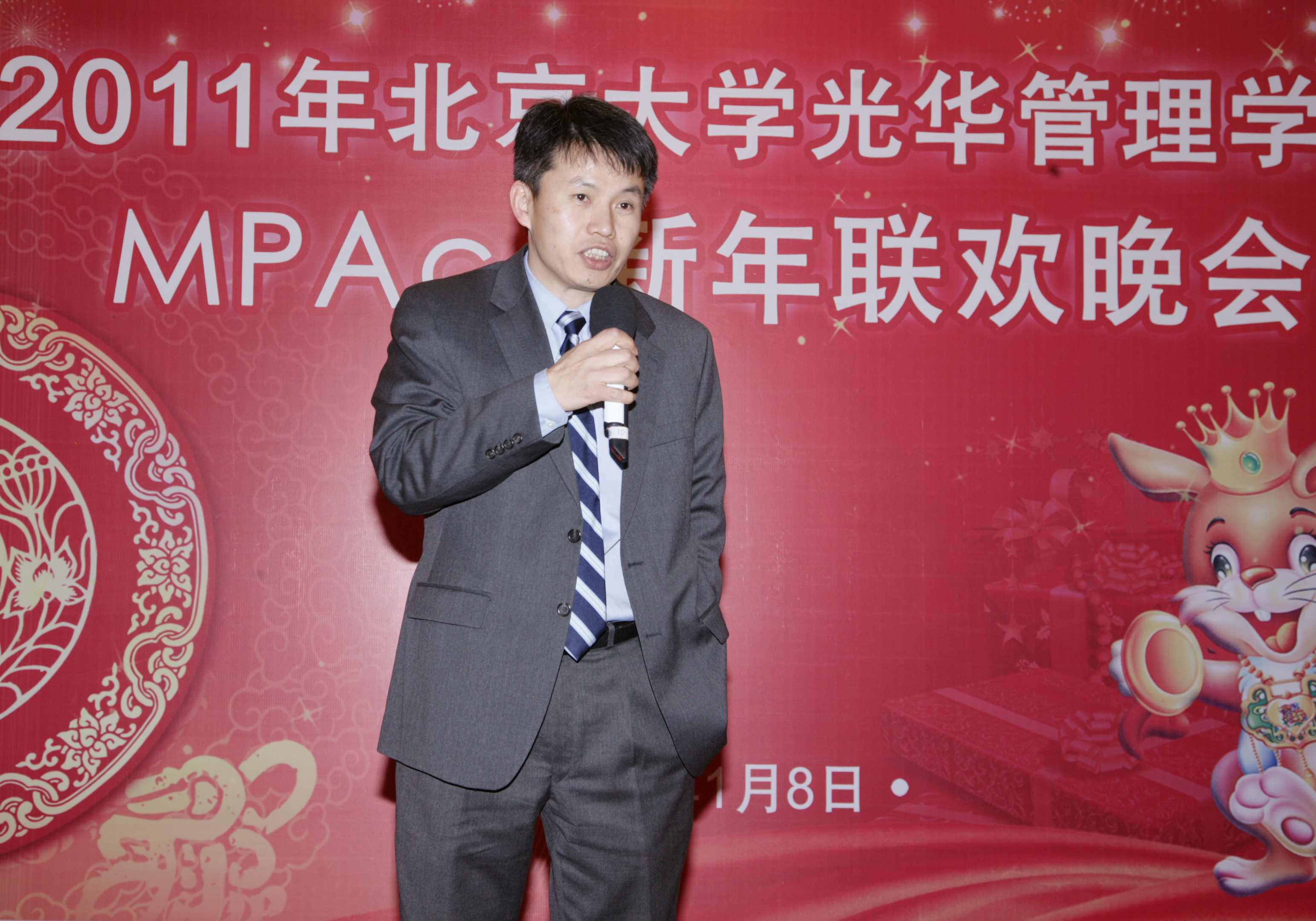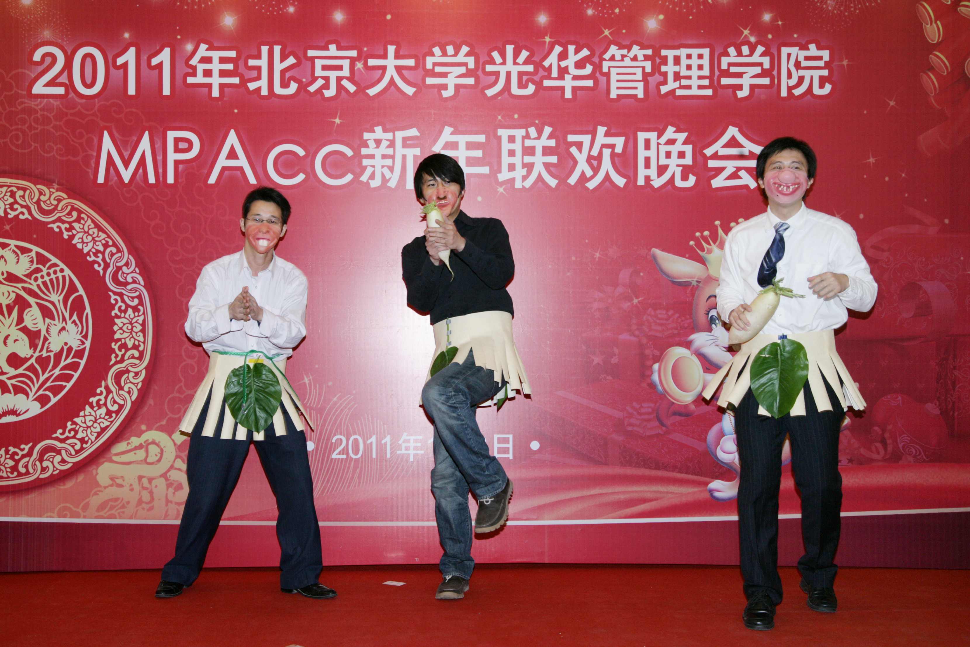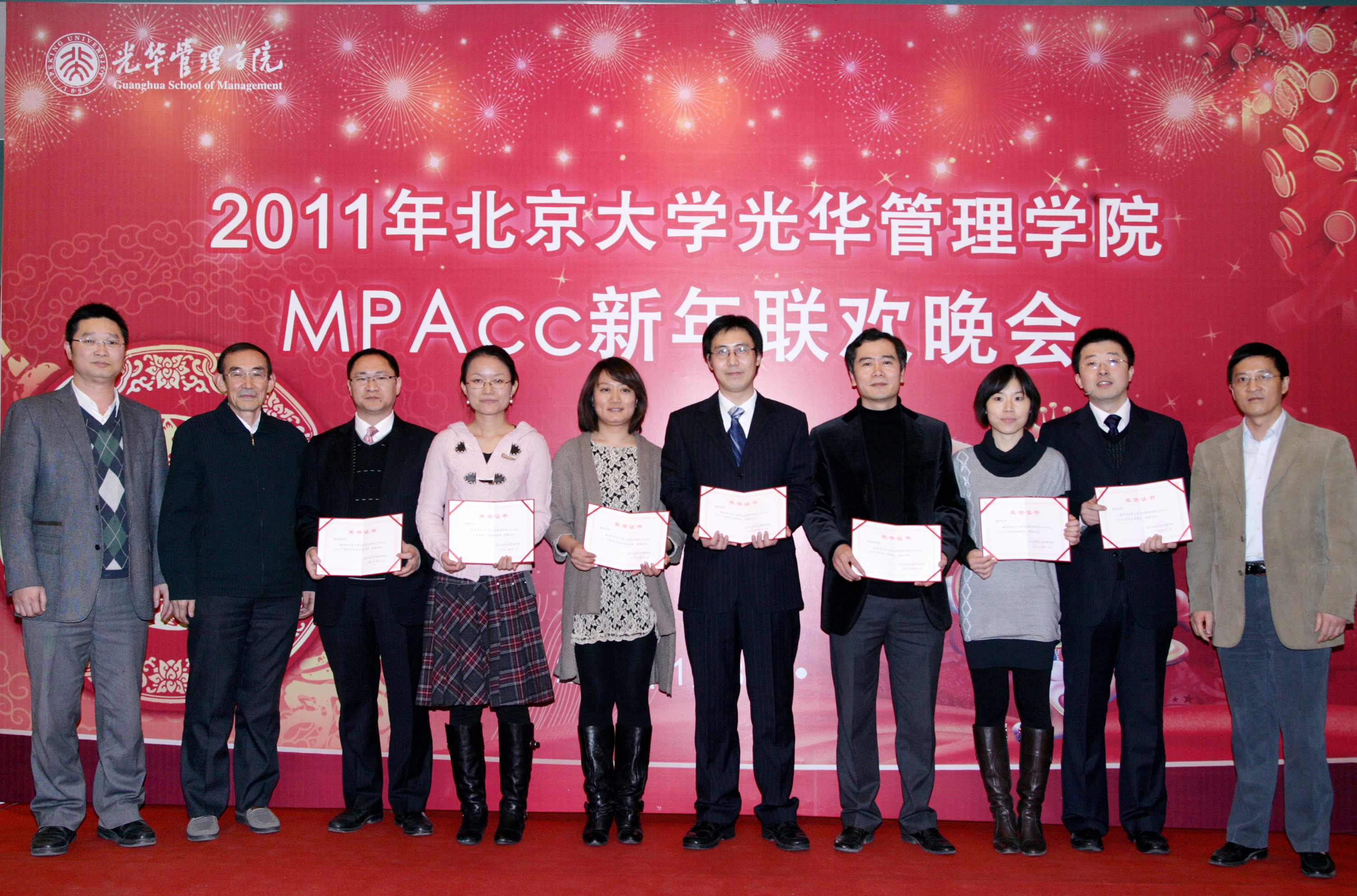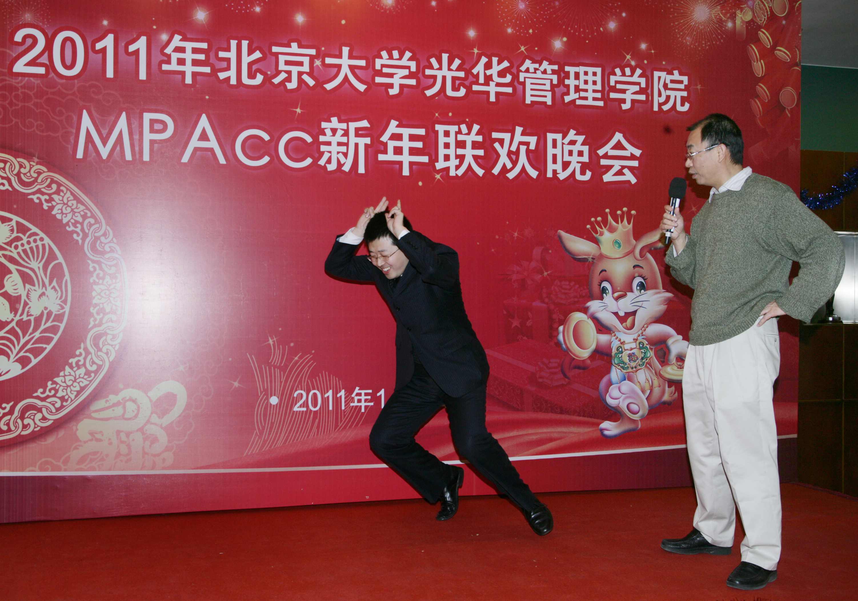 2011年1月8日,北大农园三层餐厅,新老MPAcc学生济济一堂,现场充满笑语欢歌。晚6点,北京大学光华管理学院MPAcc新年联欢会准时开始了!出席本次晚会的有:光华管理学院院长蔡洪滨教授,光华管理学院党委书记、副院长、MPAcc项目主任陆正飞教授,光华管理学院管理科学与信息系统系王其文教授,光华管理学院会计系李怡宗教授,光华管理学院会计系黄慧馨教授,光华管理学院组织管理系王新超教授,2010级MPAcc特聘导师、北京世博科脉科技有限公司总经理常骅先生,北京大学研究生院副院长、光华管理学院会计系副主任、MPAcc项目执行主任姜国华教授,光华管理学院MPAcc中心张轶、姚学远老师以及来自清华大学等兄弟院校的MPAcc学生代表。