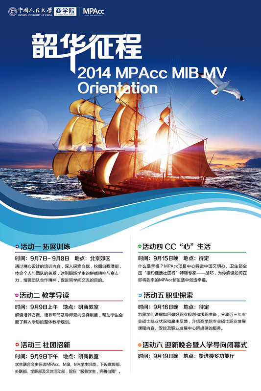 为引导新生迅速融入人大的氛围,合理规划学习生涯,MPAcc项目中心精心策划了“韶华征程 —— 2014 MPAcc MIB MV Orientation”系列活动,活动将于