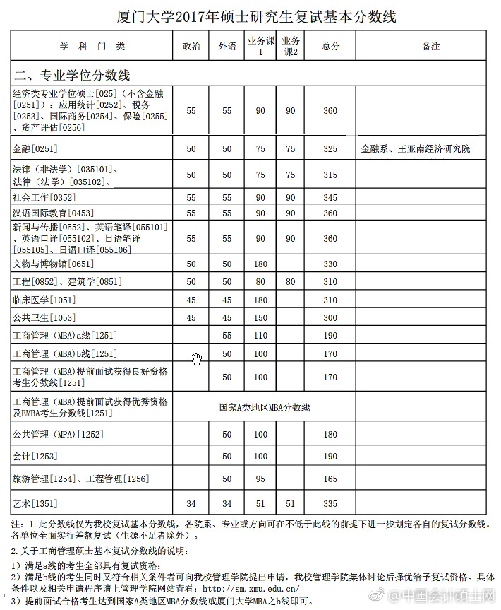 厦门大学2017年全日制MPAcc复试分数线240 / 非全日制190/50/100
