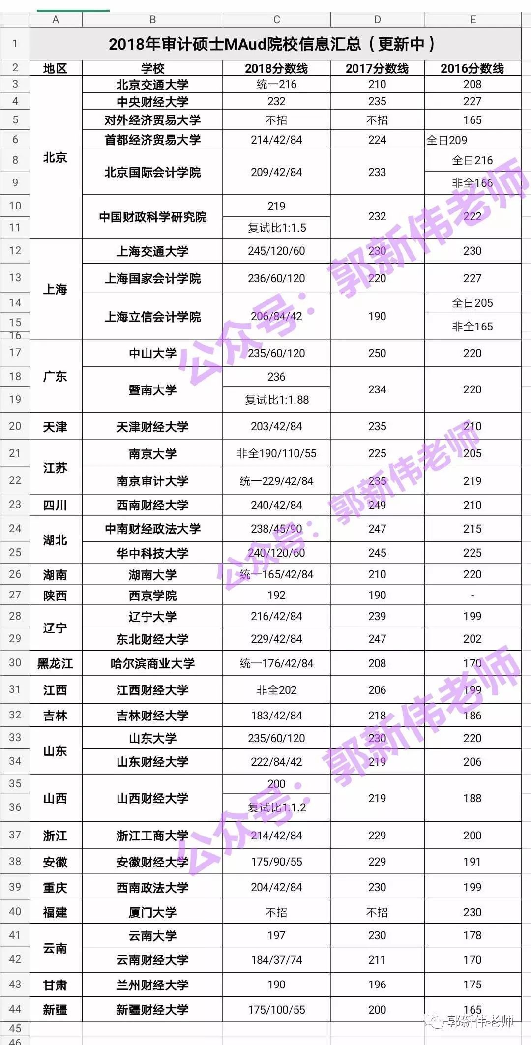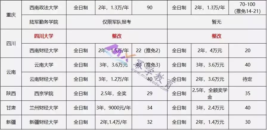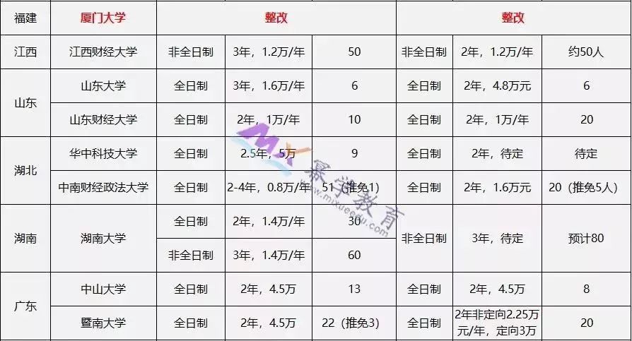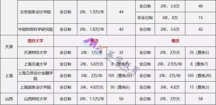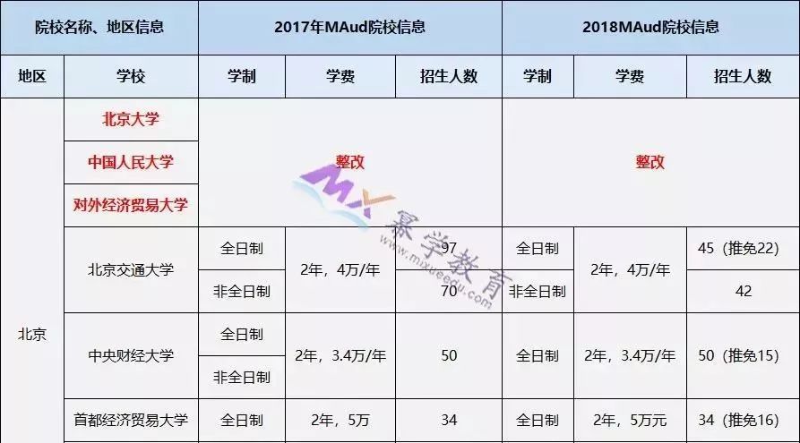 2016年,教育部发布了《国务院学位委员会关于下达2014年学位授权点专项评估结果及处理意见的通知》,通知中明确表示,北京大学、对外经济贸易大学、中国人民大学、南开大学、厦门大学、四川大学等6所院校审计硕士(MAud)专业学位授权点,自2016年3月起要进行为期2年的“限期整改”。故这6所院校在2017、2018年是不进行招生的。